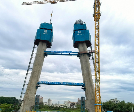 目前項(xiàng)目已完成汕頭側(cè)墩下部結(jié)構(gòu)、箱梁預(yù)制安裝,橋面板正加快預(yù)制進(jìn)度。主塔塔柱施工已完成總工程量的53%,正積極推進(jìn)主塔塔柱施工;主塔鋼錨梁、鋼爬梯等鋼結(jié)構(gòu)已在加工廠加工。
