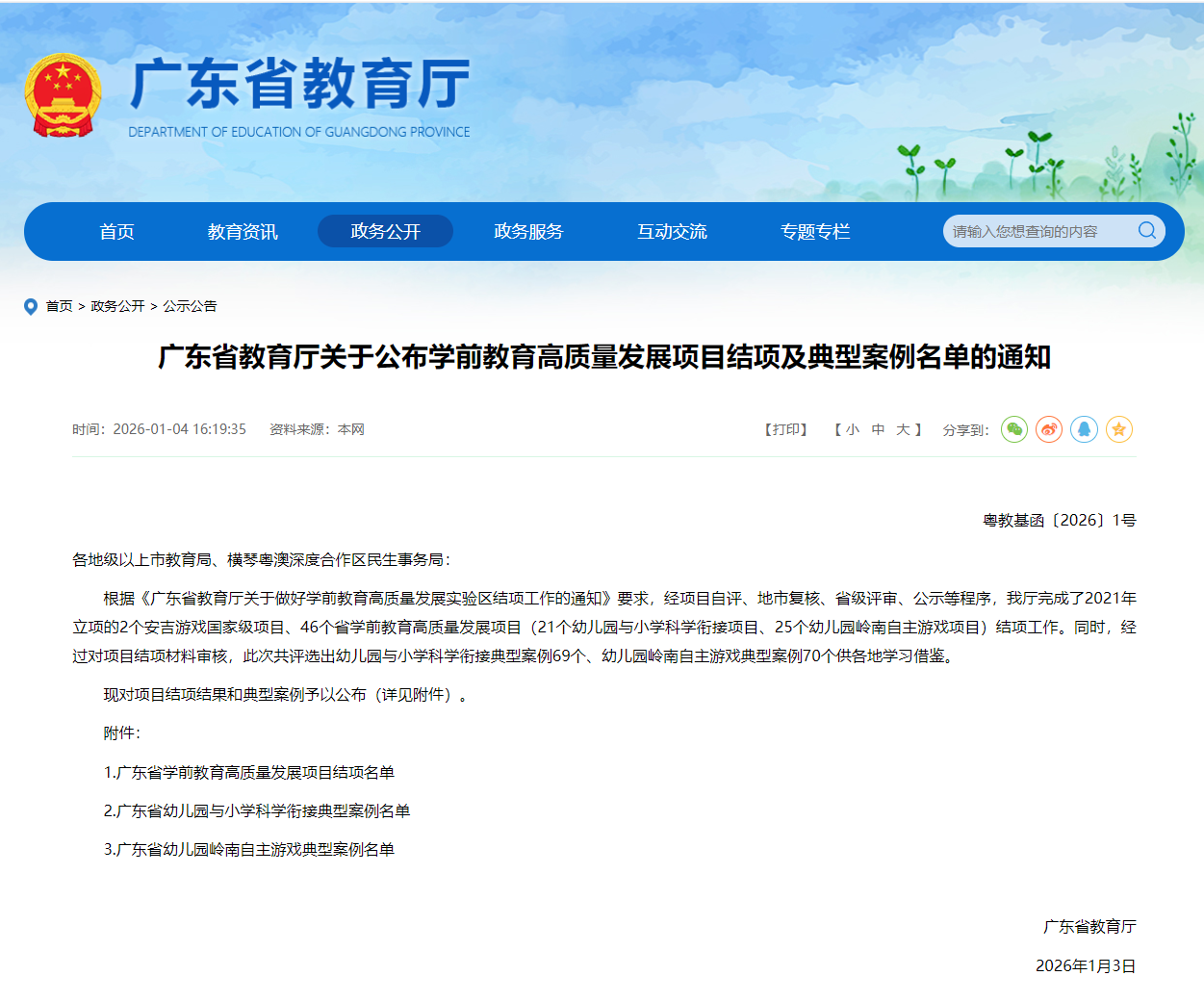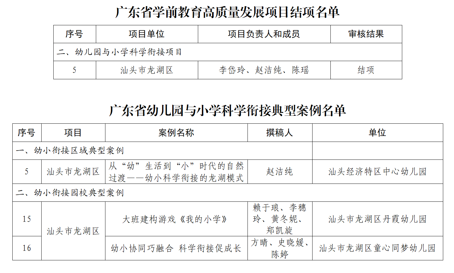 近日,廣東省教育廳正式公布學前教育高質量發展項目結項及典型案例名單。由龍湖區承擔的“廣東省學前教育高質量發展實驗區——幼兒園與小學科學銜接項目”順利通過省級評審,成功結項;同時我區案例《從“幼”生活到“小”時代的自然過渡——幼小科學銜接的龍湖模式》入選“幼小銜接區域典型案例”,《大班建構游戲<我的小學>》《幼小協同巧融合 科學銜接促成長》入選“幼小銜接園校典型案例”。