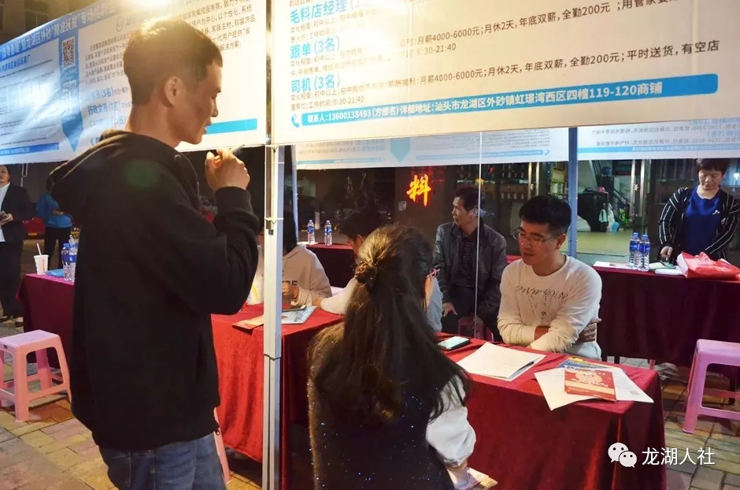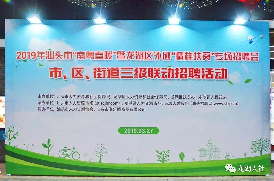 貫徹落實《汕頭市人民政府關于印發汕頭市進一步促進就業若干政策措施的實施意見的通知》和《中共龍湖區委龍湖區人民政府關于新時期精準扶貧三年攻堅實施意見》等文件精神,滿足企業用工需求,進一步推進龍湖區就業精準扶貧工作,優化城鄉人力資源配置,拓寬農民工就業渠道,幫扶貧困勞動力就業。3月27日晚上,由汕頭市人力資源和社會保障局、龍湖區人力資源和社會保障局、外砂鎮人民政府主辦的2019年汕頭市“南粵春暖”暨龍湖區外砂“精準扶貧”專場招聘會——市、區、街道三級聯動招聘活動在龍湖區外砂海樂城廣場舉行。