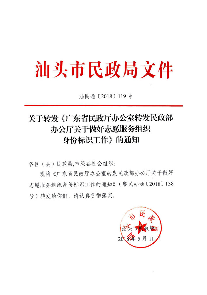 汕民通〔2018〕119 號 關于轉發《廣東省民政廳辦公室轉發民政部辦公廳關于做好志愿服務組織身份標識工作的通知》的通知.pdf