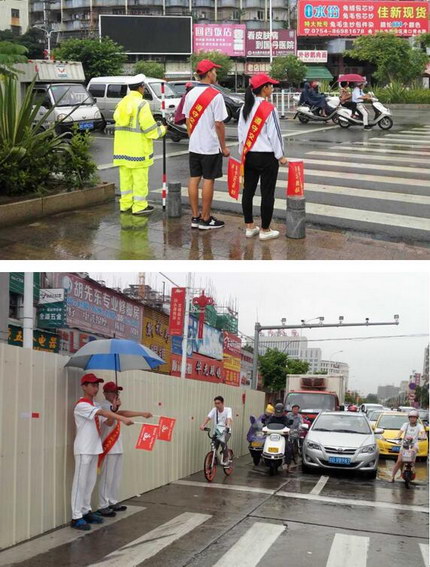 暴雨中,交警顯眼的制服在高峰期的馬路上跳躍。大雨如瓢潑一般遮蓋了眼前的天地,交警們渾身濕透,被淋得睜不開眼,卻堅守在“車河”中指揮交通。我們的志愿者有樣學樣,任憑雨水打濕衣服、鞋子,堅守崗位,協助指揮交通,為創文增添自己的一份努力,為城市文明抹上亮麗一筆,也為畢業季這個不一樣的暑假留下一份珍貴的回憶。
