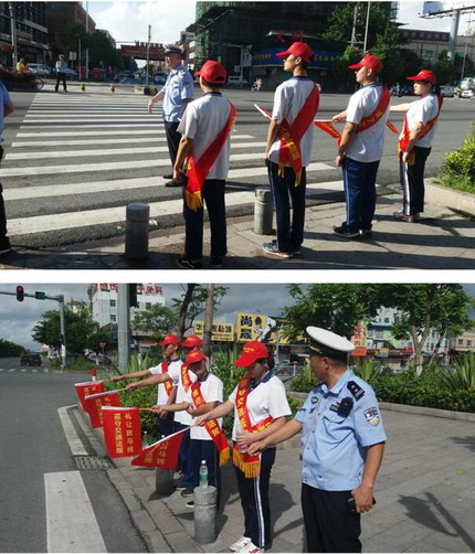 烈日下,師生志愿者在路口身板筆挺,忙著做各類標準的交通手勢。太陽炙烤著大地,陽光直射在他們的臉上,臉頰兩邊汗水直流,身上衣服已被汗水浸濕,依然堅守崗位,仍是熱情高漲踴躍參與,為能助力“創文”而倍感驕傲。