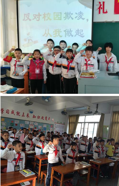 升旗儀式上,由政教處陳主任講話并帶領全體同學進行“反對欺凌,從我做起”的宣誓活動。接著,各班開展“應對校園欺凌”主題班會課,在各班主任的精心準備和認真組織下,根據不同年級的學生特點,分別采用了教學視頻、講故事、事例分析、小組討論等多形式開展活動。讓學生通過淺顯易懂的例子,生動有趣的故事,起到潛移默化的作用,爭做一名學法、懂法、守法好少年。