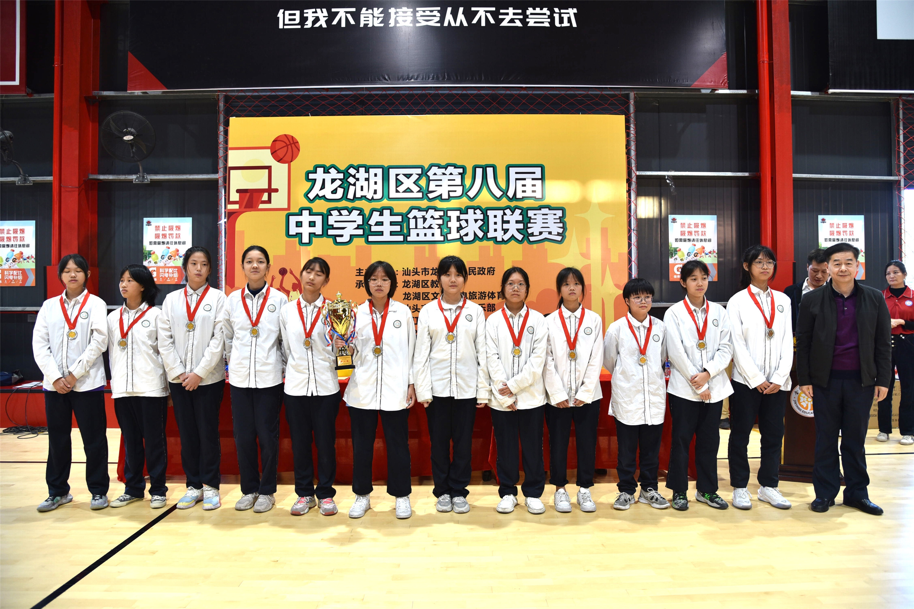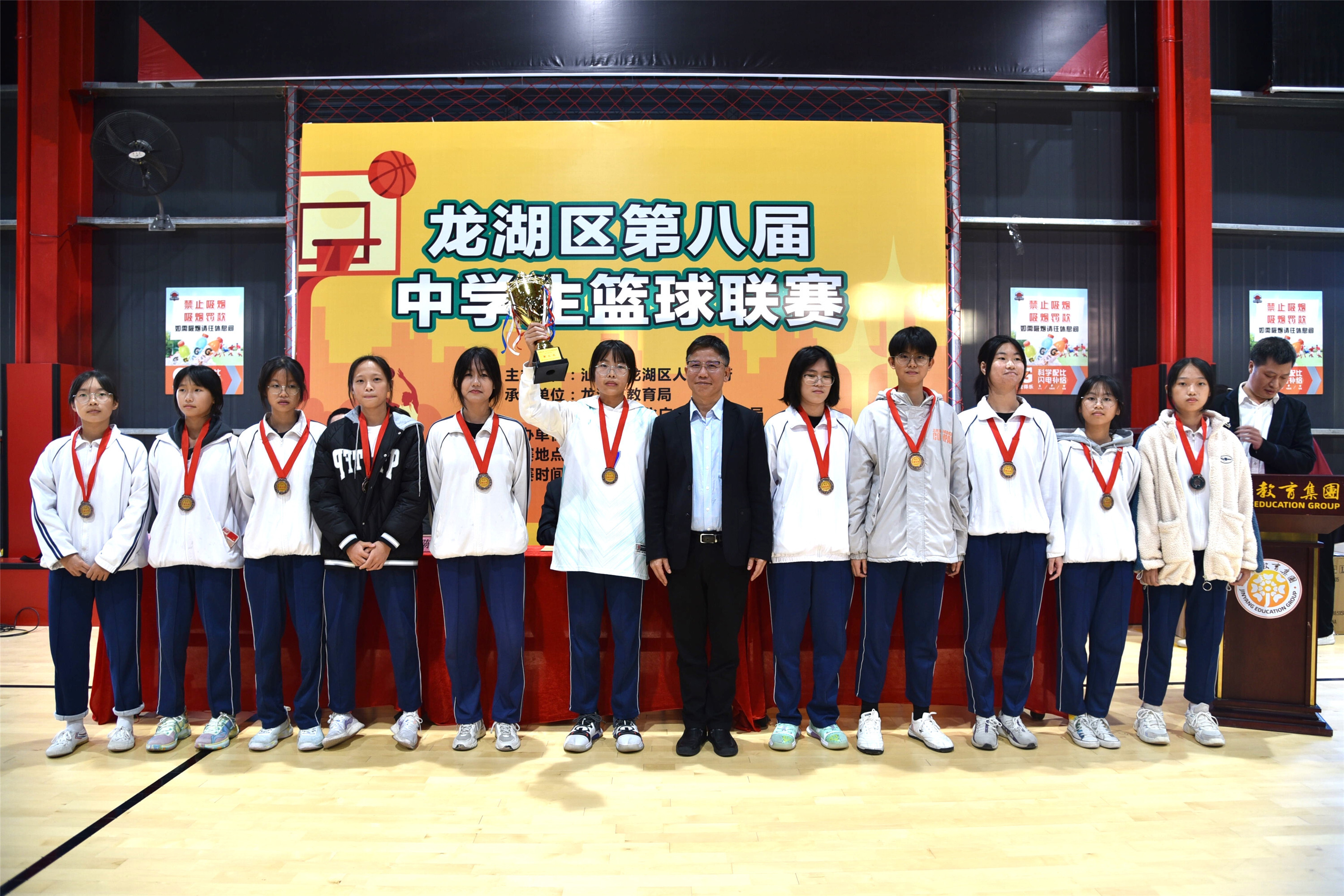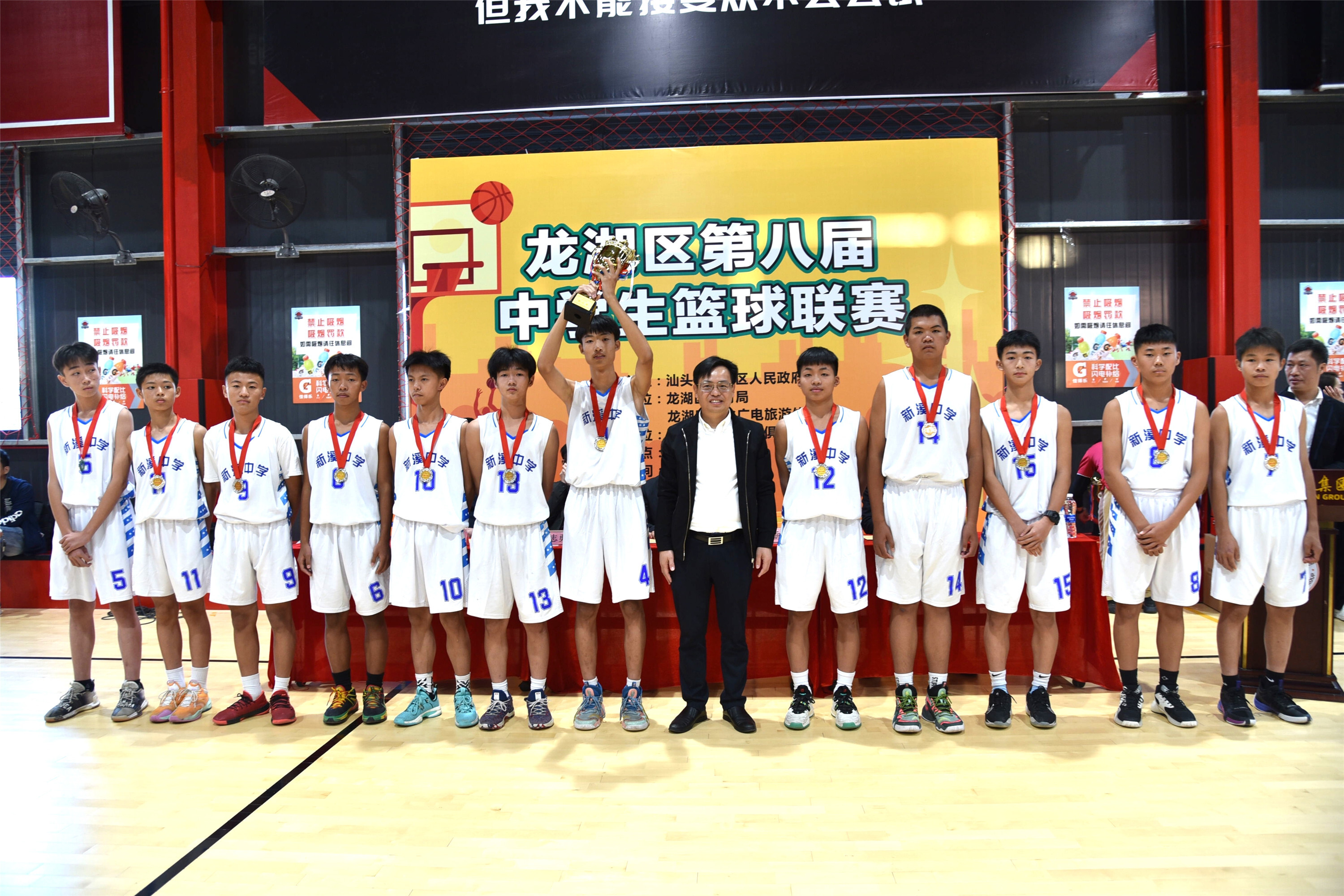 嗶————”隨著終場哨聲響起,場下一片歡呼與沸騰,謝易初中學(xué)以7164的比分優(yōu)勢奪得冠軍!經(jīng)過11天、共51場緊張激烈的比拼,這場由龍湖區(qū)人民政府主辦,龍湖區(qū)教育局、龍湖區(qū)文化廣電旅游體育局承辦,汕頭市浦江籃球俱樂部協(xié)辦的龍湖區(qū)第八屆中學(xué)生籃球聯(lián)賽圓滿落幕。
