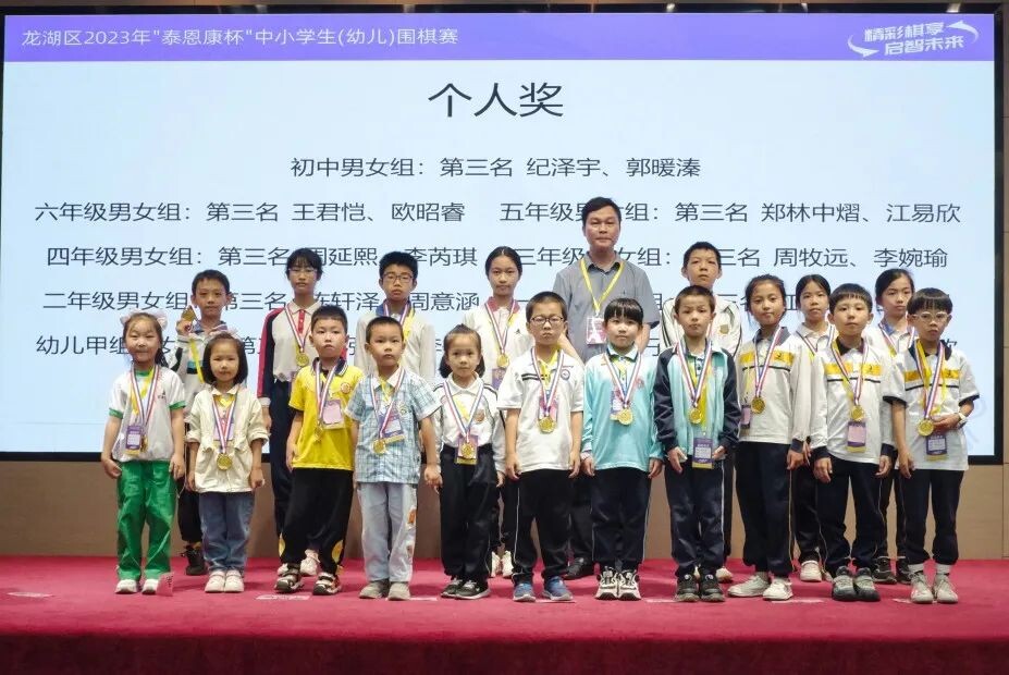 經過激烈角逐,初中組團體總分前四名分別是:林百欣中學、廣東第二師范學院龍湖附屬中學、龍湖實驗中學和金灣學校;在小學組團體總分中,金陽小學躋身首位,金暉小學位居第二名,丹霞小學、金珠小學、金灣學校、香陽學校、錦泰小學、金濤小學分列三、四、五、六、七、八名;幼兒組方面,童心同夢幼兒園獲團體第一名、美恩幼兒園第二名、麗水莊幼兒園第三名。個人賽方面,黃晟軒、謝承翰、黃鐘楊等18位小棋手摘得幼兒園、小學、初中男女子組桂冠。