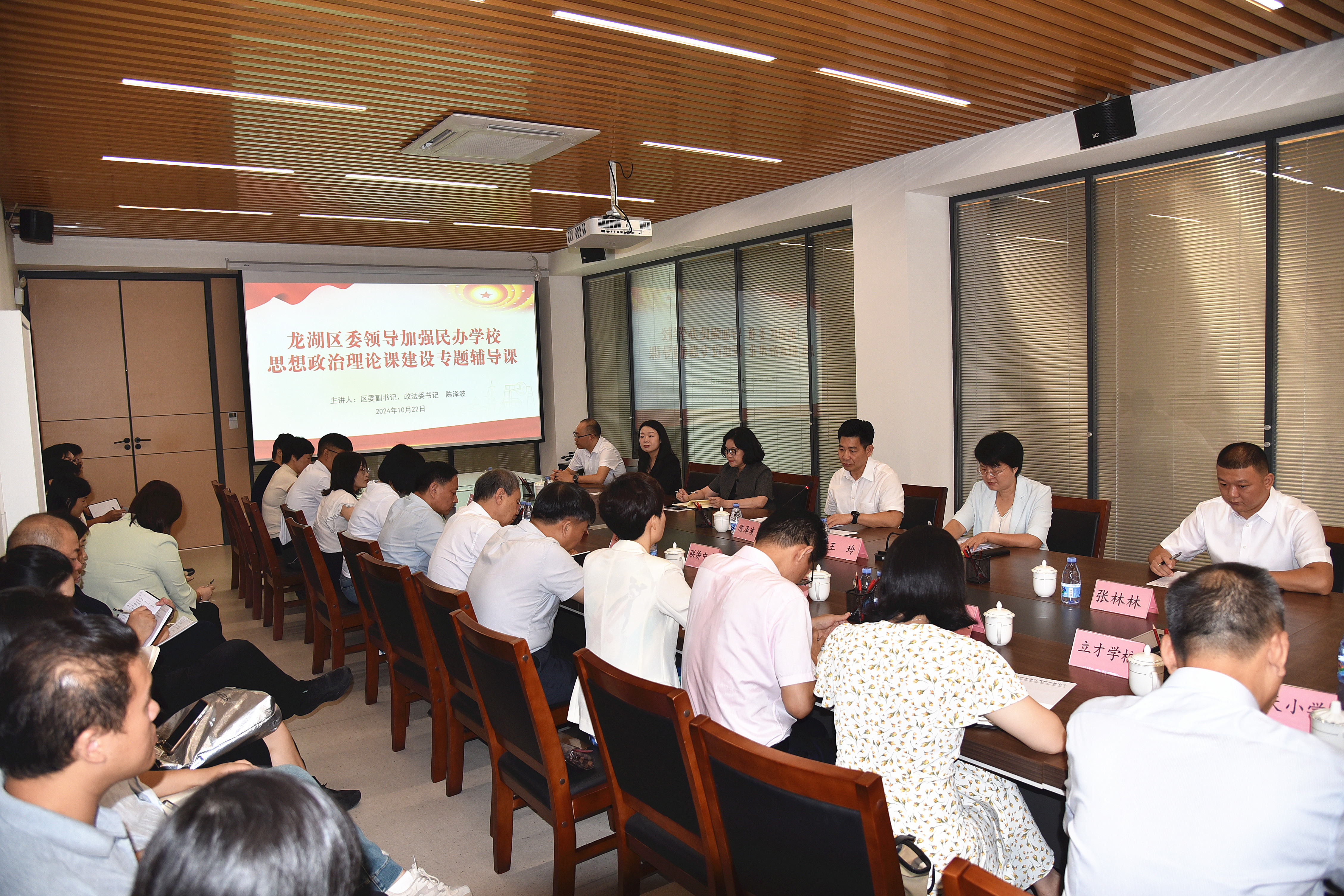 為全面貫徹習近平總書記對新時代學校思政課建設的重要指示精神,落實立德樹人根本任務,進一步推動我區民辦學校思政課改革創新,提高思政課教學質量,10月22日上午,龍湖區委副書記、政法委書記陳澤波同志在區教師發展中心為全區民辦學校黨組織書記、校長作加強學校思想政治理論課建設專題輔導課。區政協領導,區教育局主要負責同志及有關負責同志,區教師發展中心有關負責同志和中學、小學道德與法治教研員,全區民辦學校黨組織書記、校長和分管德育副校長參加活動。龍湖區教育局黨組書記、局長王玲同志主持會議。