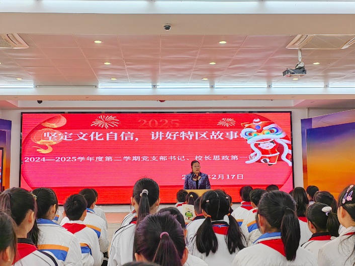 學(xué)校黨支部書記、校長紀(jì)勝輝以“逐丹日新”“追霞自信”“丹心向黨”三個關(guān)鍵詞為全校師生帶來開學(xué)思政第一課,鼓勵同學(xué)們積極參與校園活動,從“小問號大思考”“小老師大成長”“小課題大學(xué)問”等活動中學(xué)習(xí)新知識、掌握新技能,像Deepseek一樣深度思考,勇于嘗試,敢于創(chuàng)新,每天進步一點點;從電影《哪吒之魔童鬧海》中汲取力量,堅持文化自信,傳承和發(fā)揚潮汕優(yōu)秀傳統(tǒng)文化;像黃旭華院士一樣為祖國作貢獻,用一顆赤誠的愛國之心服務(wù)家鄉(xiāng),服務(wù)社會,報效祖國。(陳曉洵)