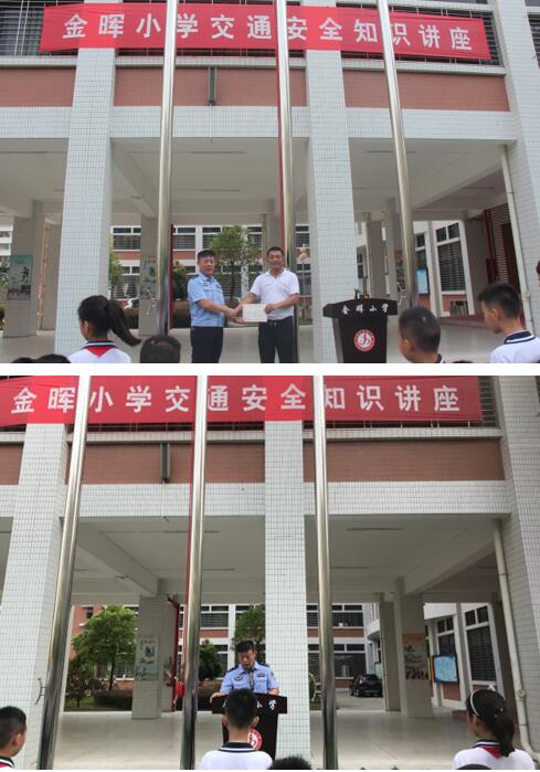 活動中,翁利茂隊長首先對金暉小學被上級有關部門評為“廣東省交通安全文明示范學校”表示祝賀。緊接著,他又向廣大師生們講解了出行交通安全注意事項及交通安全常識,針對學生的出行特點,重點講解了安全過馬路、安全乘車、騎車等出行常識,根據學生易發生的交通違法行為,著重講解了道路交通基本通行原則。他號召同學們要從我做起,自覺遵守交通法規,堅決抵制危險、不文明交通的行為。