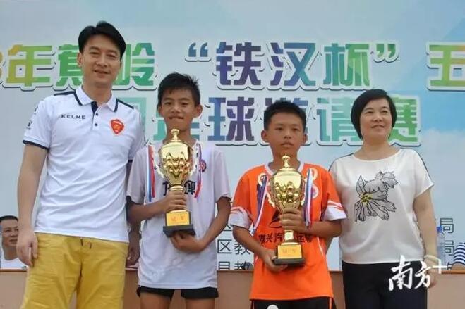 蕉嶺縣教育局局長(zhǎng)張慧(右一)、梅縣鐵漢足球俱樂(lè)部青訓(xùn)部總裁楊朋鋒(左一)為獲得冠軍的汕頭市龍湖小學(xué)(右二)、梅江區(qū)龍坪小學(xué)足球隊(duì)代表頒獎(jiǎng)