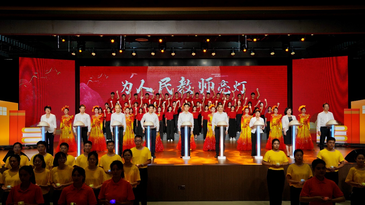 大會(huì)進(jìn)行了“師道傳承 匠心龍湖”師生文藝展演,用精彩的文藝節(jié)目、藝術(shù)化的表現(xiàn)形式再現(xiàn)教壇故事,生動(dòng)展現(xiàn)了廣大教師教書(shū)育人、培根鑄魂的精神風(fēng)貌和時(shí)代風(fēng)采。大會(huì)還發(fā)起為人民教師亮燈公益倡議。