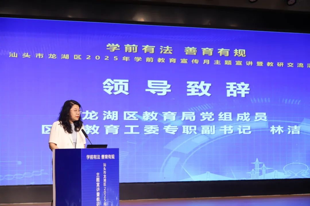 活動伊始,龍湖區教育局黨組成員、區委教育工委專職副書記林潔致辭,向參會領導嘉賓介紹龍湖區學前教育發展的情況。汕頭市教師發展中心副主任楊力群發表講話,強調要提高政治站位,深化認識,將學習宣傳貫徹《學前教育法》擺在突出位置;要壓實責任,協同推進,切實履行規劃、投入、監管和保障等法定職責;要聚焦關鍵,狠抓落實,全面加強教師隊伍建設,提升專業素養;要加強宣傳,營造氛圍,凝聚全社會關心支持學前教育改革發展的共識,營造尊法學法守法用法的良好氛圍。