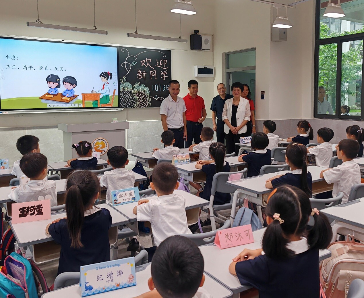 新學年,新亮點。龍湖區金陽學校教育集團屬下的中陽學校和經緯源小學這兩所新辦學校,以全新的精神面貌迎來了第一批入讀學生。開學首日,區教育局局長王玲同志帶隊到兩校巡視開學情況,為新生輕點朱砂啟智,祝愿新生學習一點就通,并走進教室與孩子們親切交談,關心師生的學習與生活,并重點檢查了校園安全及教育服務工作落實情況,寄語學校班子團結協作,發揮優勢,主動作為,努力辦好人民滿意的教育。