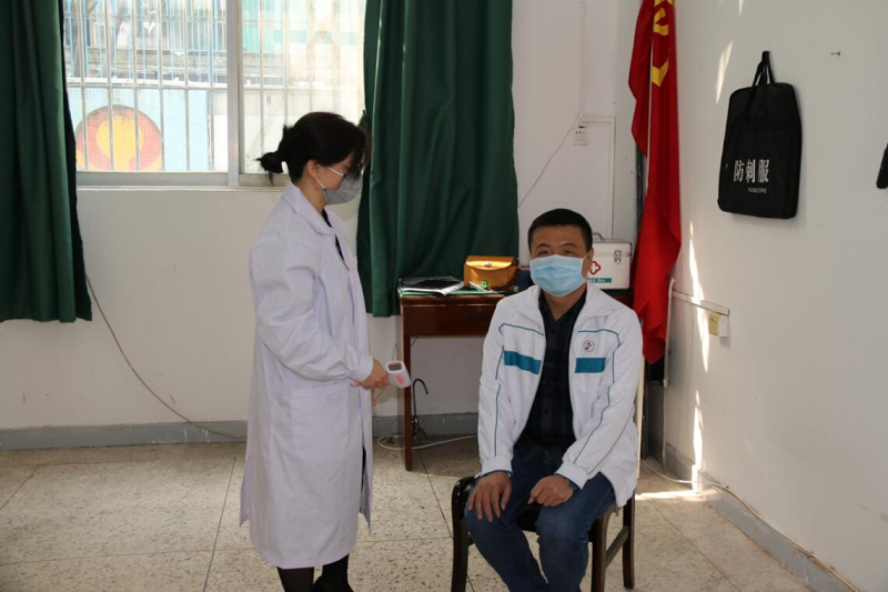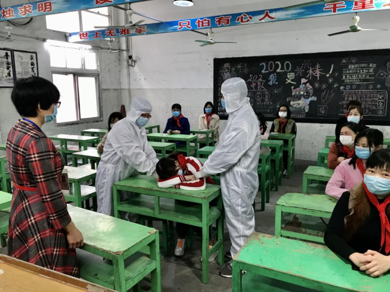 演練中,發(fā)現(xiàn)1名“學(xué)生”有發(fā)熱情況,值班行政迅速將其帶到空曠地再次檢測(cè)體溫,經(jīng)再次確認(rèn)發(fā)熱后,啟動(dòng)應(yīng)急預(yù)案,帶至臨時(shí)留觀室進(jìn)一步檢測(cè),詢問(wèn)該“學(xué)生”相關(guān)情況及近期活動(dòng)軌跡等,并記錄相關(guān)數(shù)據(jù),分級(jí)上報(bào)、通知家長(zhǎng)、送醫(yī)治療,人員離開(kāi)后進(jìn)行噴藥消毒……