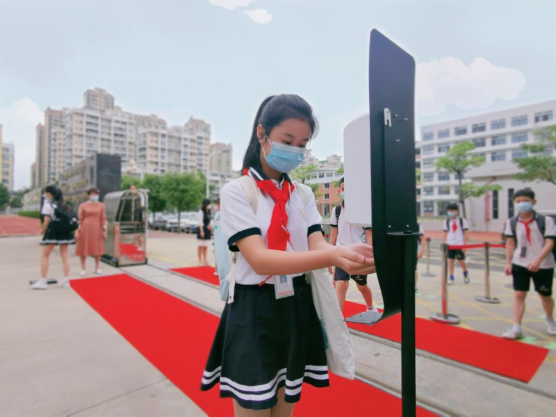 早上七點鐘剛過,迫不及待想要上學的同學們陸續出現在各學校門口。在老師們的引導下,孩子們測溫、洗手,有序進入校門,分通道回教室……校園里重新響起了朗朗書聲。錯峰返校、分小班教學、查看健康卡、體溫檢測、雙手消毒,各學校在每個環節都進行了精心安排。由于天氣非常炎熱,且有強對流天氣出現,各學校還專門設立了入校綠色通道,對入校體溫檢測點進行靈活安排,積極應對惡劣極端天氣的干擾。