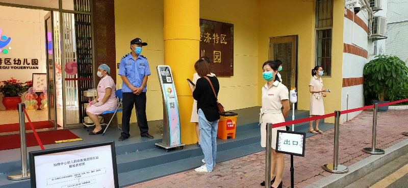 幼兒離園也嚴(yán)格實(shí)行分時(shí)分段錯(cuò)峰,家長(zhǎng)在指定區(qū)域間隔一米排隊(duì)等候,在接到幼兒后按指引路線有序離開(kāi)。為緩解校門(mén)口人群密集的壓力,汕特中心幼兒園還因地制宜開(kāi)放了消防門(mén),劃定接送路線,引導(dǎo)家長(zhǎng)適當(dāng)分流,收到了良好的疏散效果。