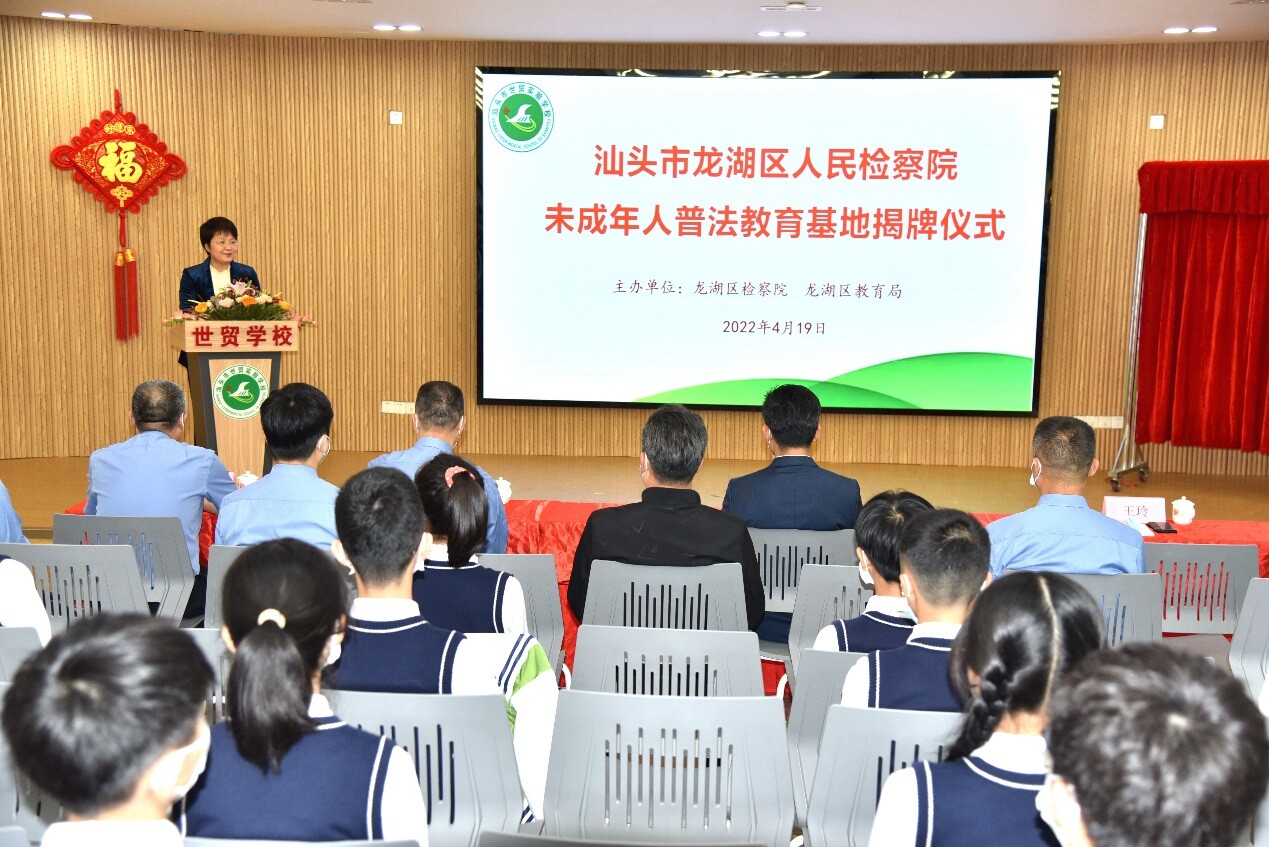 為全面加強新時期未成年人法治教育,深入開展法治進校園工作,4月19日,龍湖區在世貿實驗學校舉行“汕頭市龍湖區人民檢察院未成年人普法教育基地”揭牌儀式。龍湖區分管領導,區檢察院、區教育局主要領導及相關同志,世貿實驗學校師生代表參加了揭牌儀式。