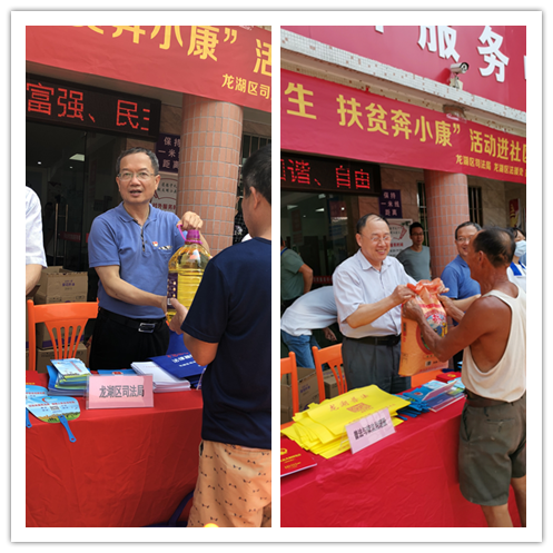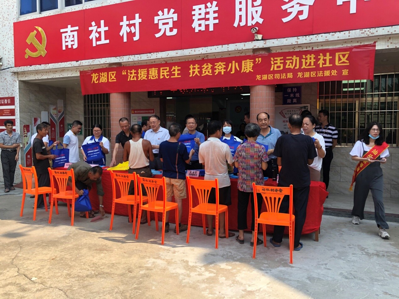 為充分發揮法律援助惠民生職能作用,進一步助力復工復產、決戰脫貧攻堅,將法律援助關愛和幫助貧困群眾的工作做細、做實,7月15日上午,龍湖區司法局、龍湖區法援處組織局全體扶貧干部和法律援助志愿者前往龍華街道南社居委開展“法援惠民生 扶貧奔小康”進社區活動。