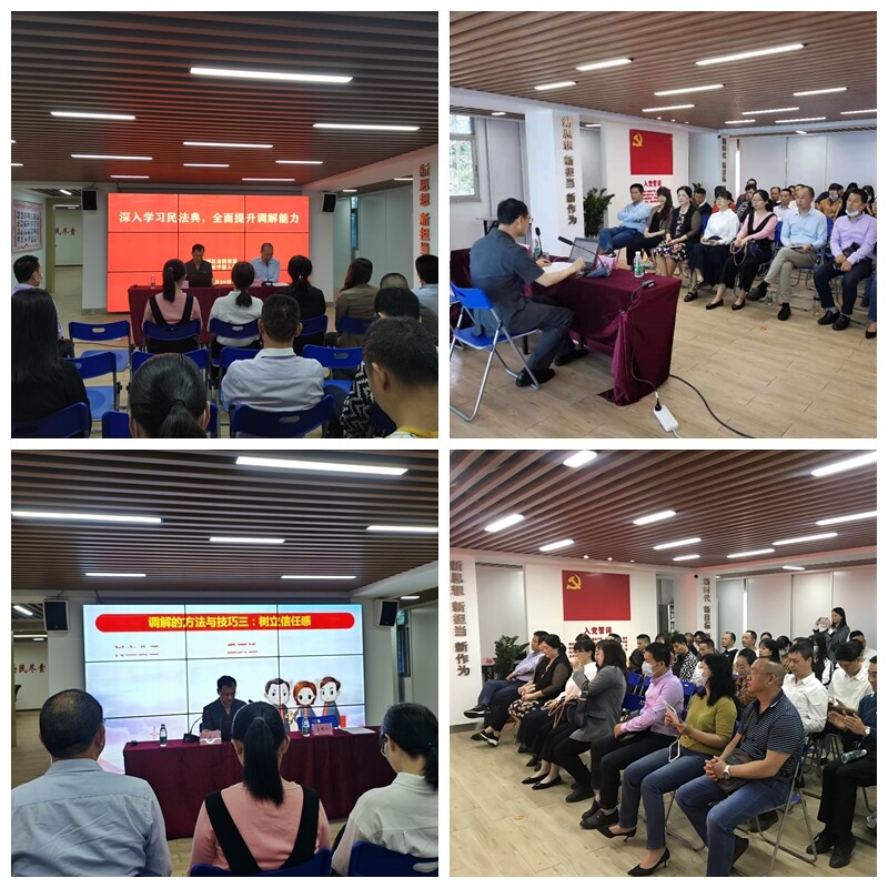 講座邀請了汕頭中院民四庭四級高級法官江炯坤進行專題解讀。江法官重點向參會人員介紹了《中華人民共和國民法典》有關條款和人民調解中常用的技巧,結合自身工作經歷,運用真實案例,講述了人民調解、行政調解、司法調解相結合的重要意義、調解基本法律知識、調解的方法技巧和經驗等,授課內容通俗易懂、貼近實際、可操作性強。