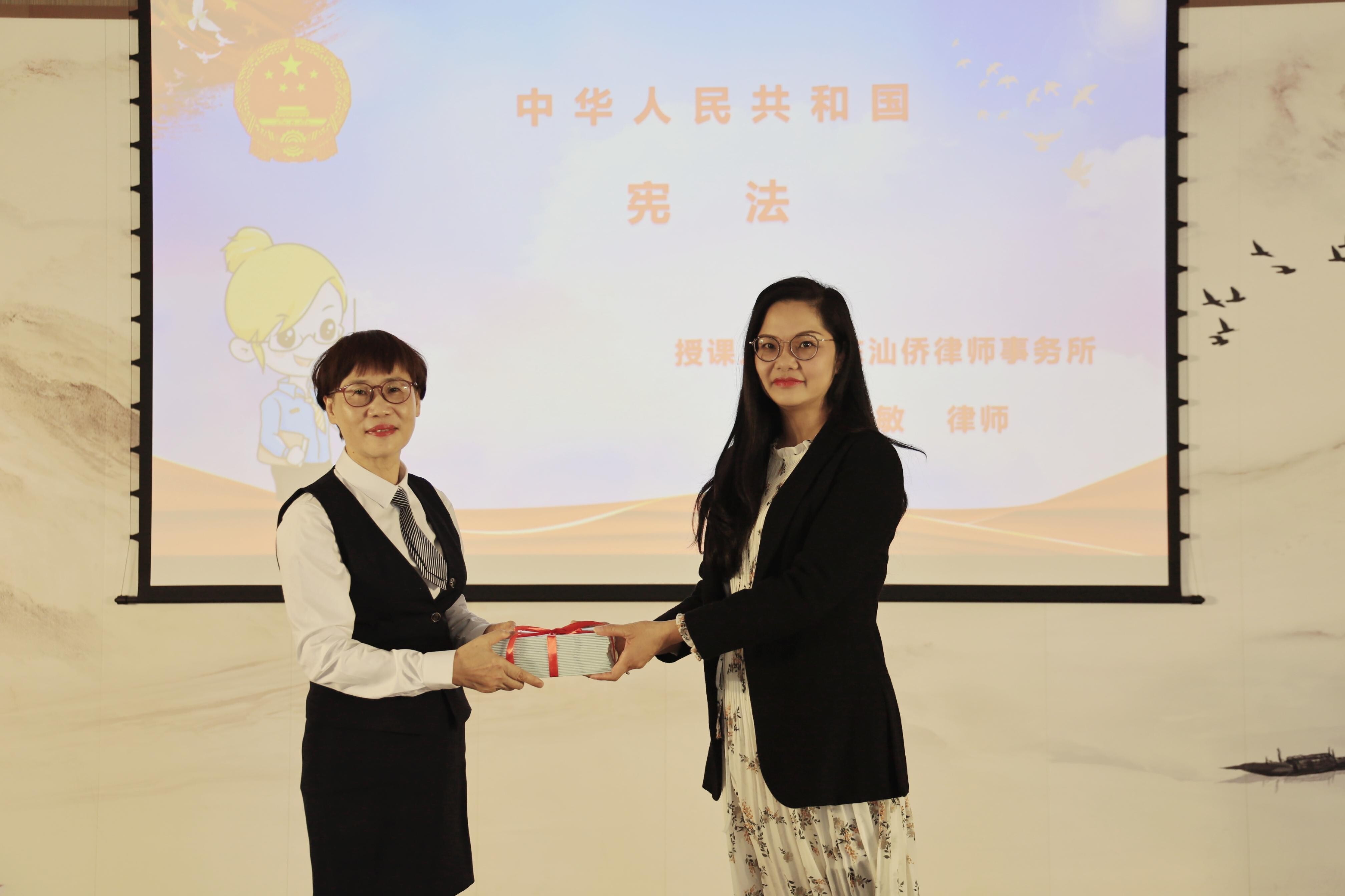 活動開始由區普法辦向嘉晉學校贈送了《中華人民共和國憲法》和《中華人民共和國民法典》宣傳圖冊,接著由嘉晉學校法治副校長——廣東汕僑律師事務所張曉敏律師為師生們授課,張律師用生動的語言以及通俗易懂的例子很好的詮釋了憲法的相關條例內容。