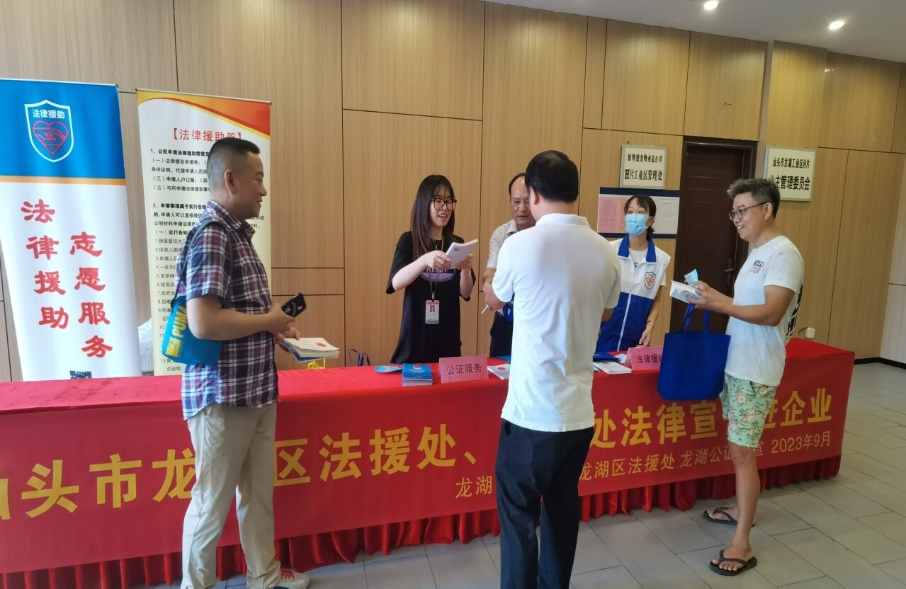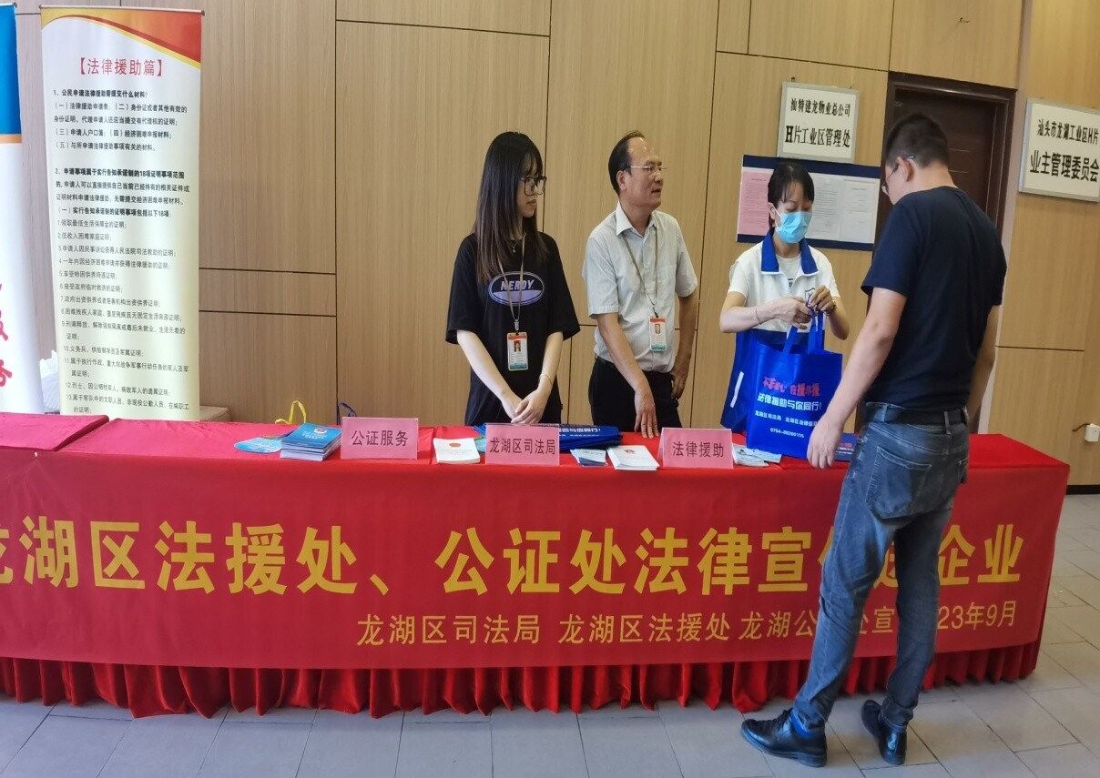 為了積極推進“法援惠民生”品牌建設,切實提高廣大群眾對法律援助和公證辦證的知曉率,2023年9月19日,龍湖區法律援助處聯合公證處走進龍湖工業區開展普法宣傳活動。