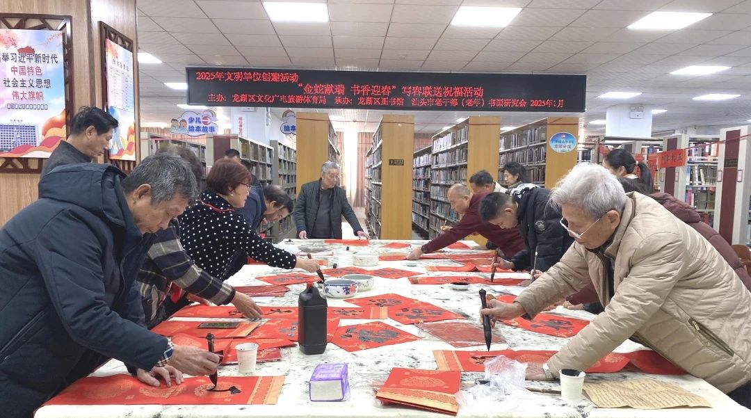祥龍辭舊歲,金蛇迎新春。春節(jié)將近,龍湖區(qū)圖書館舉辦以“金蛇獻(xiàn)瑞 書香迎春”為主題的寫春聯(lián)送祝福活動。此次活動旨在通過寫春聯(lián)這一傳統(tǒng)藝術(shù)形式,傳承和發(fā)揚中華優(yōu)秀傳統(tǒng)文化,讓書香與年味相融合,為即將到來的新春佳節(jié)增添一抹獨特的文化色彩。