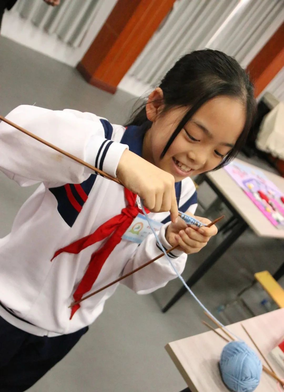 同學們認真體會毛衫手工編制的樂趣,臉上洋溢著笑容,非常享受勞動的過程,整個會場其樂融融。