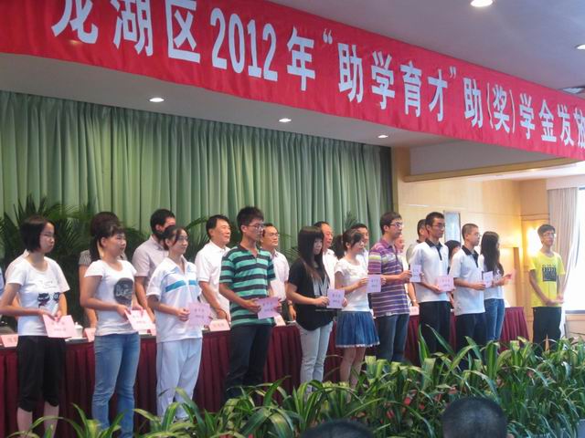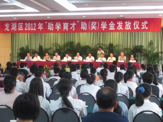 8月28日,龍湖區舉行“龍湖區2012年助學育才助(獎)學金發放儀式”,向全區286名貧困家庭的學子發放助學金,并向在今年高考、中考中取得優異成績的48名優秀學子頒發獎學金。區各套班子領導和龍湖(香港)海外聯誼會嘉賓親自為學子們頒發助(獎)學金。